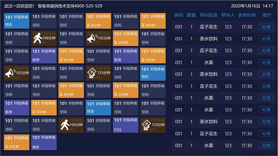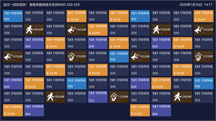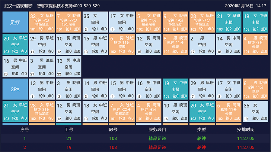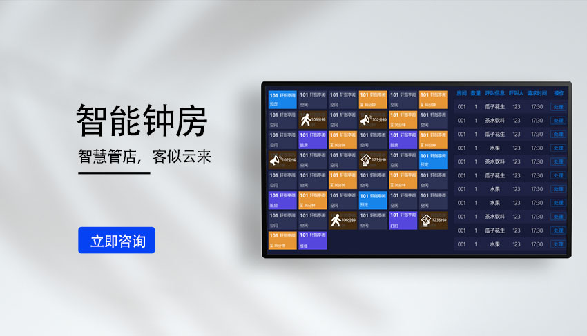 智能钟房端为门店钟房、卫生房、水吧、大厅等位置实时提供技师或房间信息,当技师被调派或有呼叫、房间待打扫时,语音提醒员工处理,若未处理,会一直显示在屏幕上,防止员工遗漏,提高门店人员工作效率。