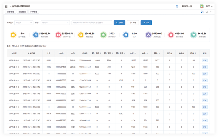 休闲行业收银系统支持连锁会员跨店充值、消费和结算